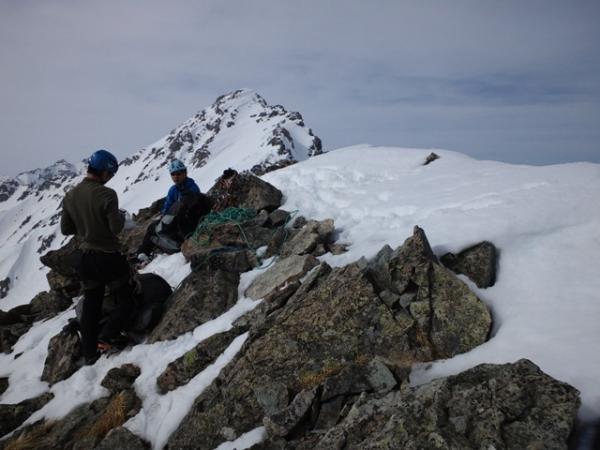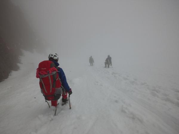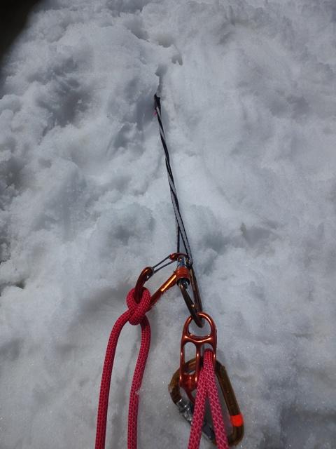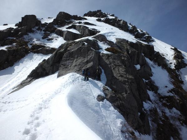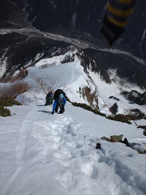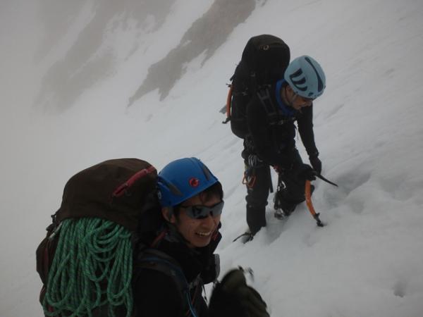 前半の雪壁は雪崩れたり踏み抜いたりと、非常に登りづらい雪質でした。