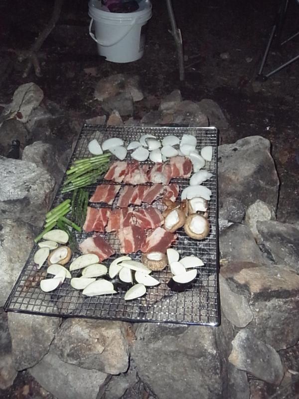 夜のバーベキューは牛肉に豚肉、ベーコンに野菜と豪華なメニュー。
