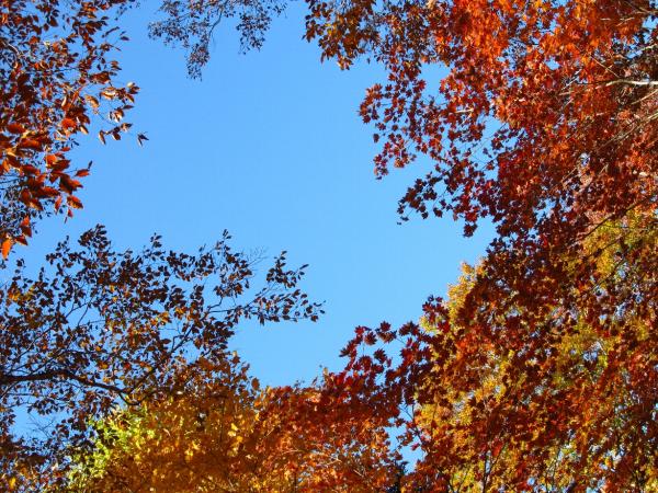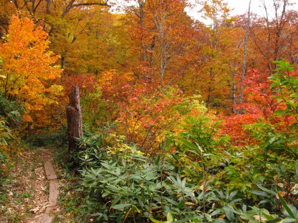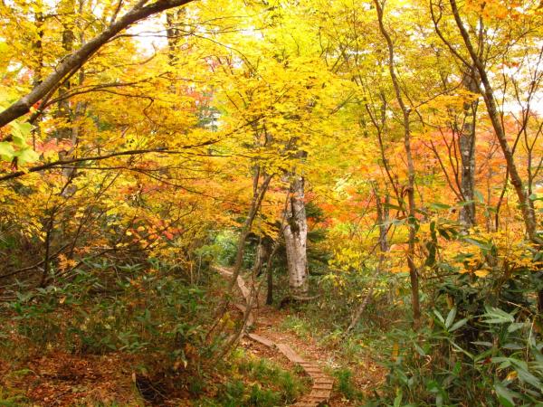 さわやかな風が吹く大江湿原を抜けて、沼山峠からバスで帰ります。途中。バスから見下ろすブナ平の紅葉は圧巻。余裕があったらしく、バスの運転手さんが、その景色を楽しめるようにゆっくり車を走らせてくれました。