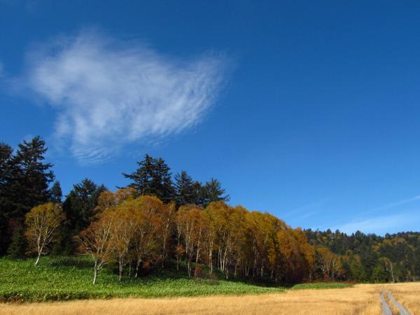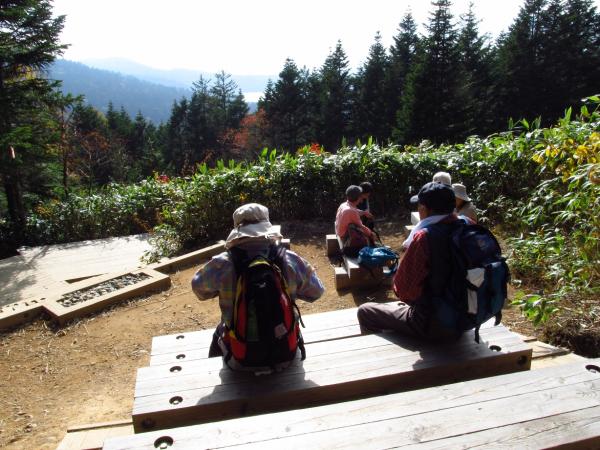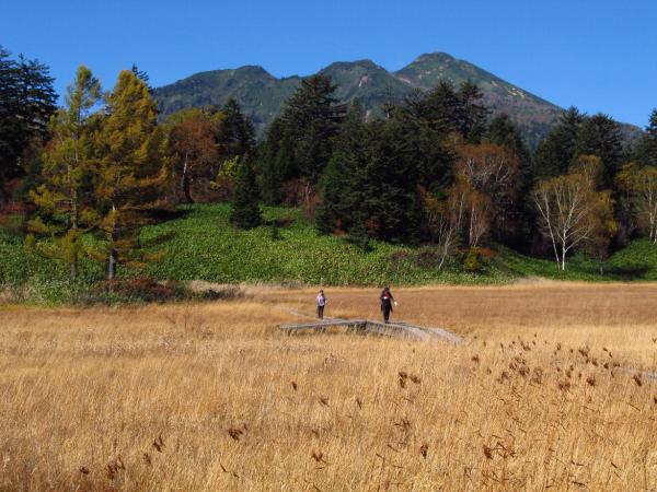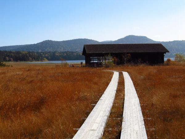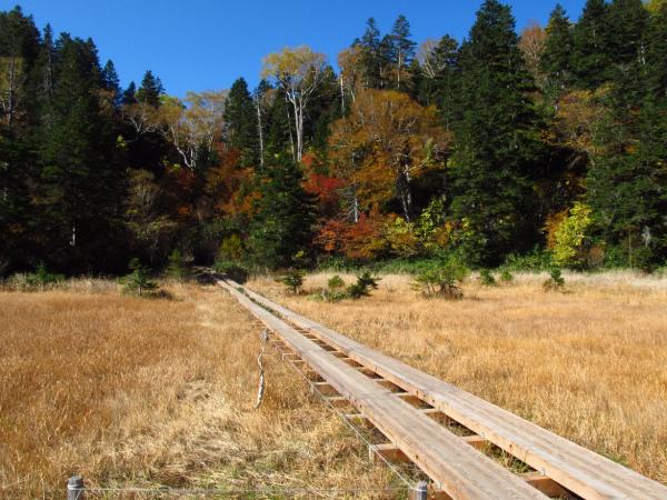 色づく木々の隙間から差し込む陽の光を楽しみながら、白砂峠を越えると、今回最も綺麗だった白砂田代に出ました。青い空の下、木々の紅葉と草紅葉に囲まれ、動きたくない気分。重い腰を上げて、今期の営業が終わって解体中の沼尻休憩所を過ぎ、尾瀬沼をまわります。ビジターセンター横の売店の美味しいコーヒーをいただきながらお昼をとりました。