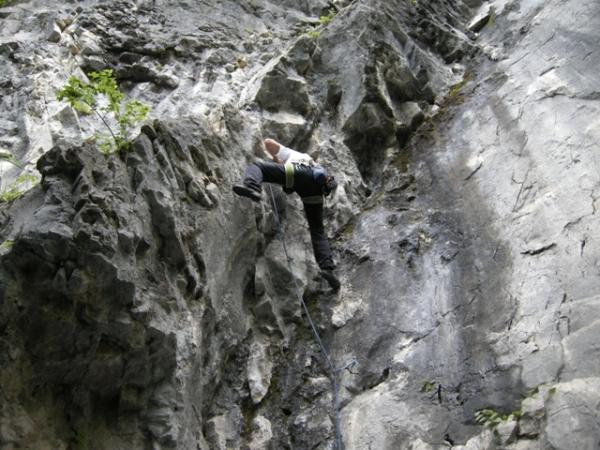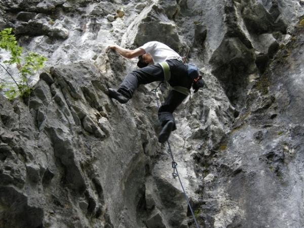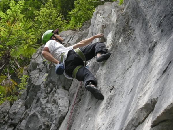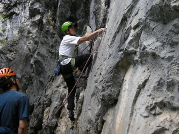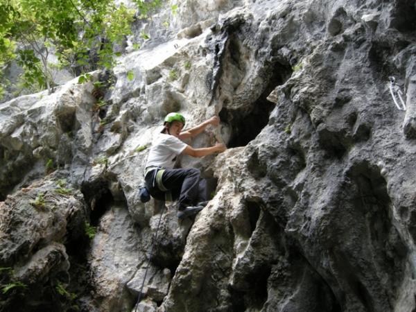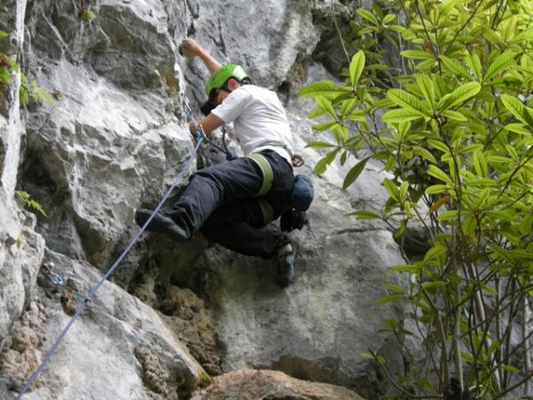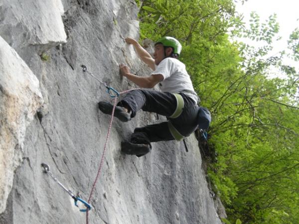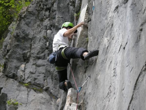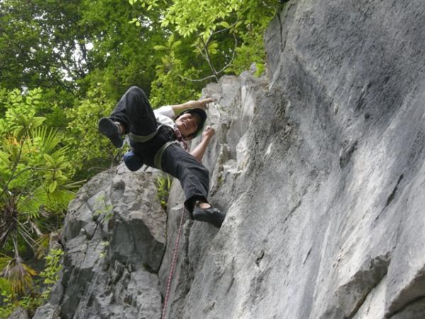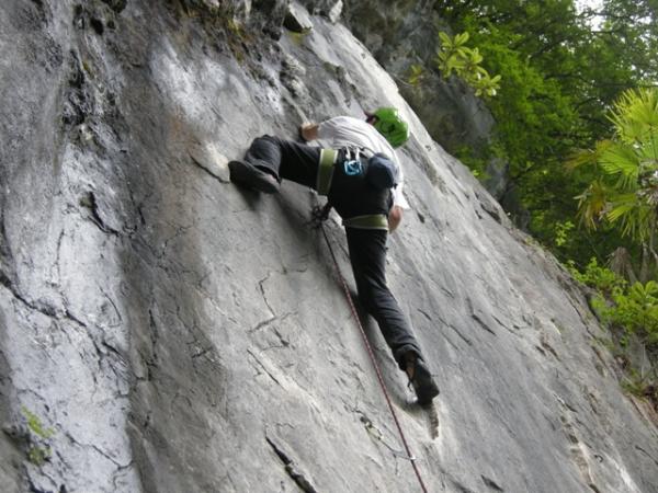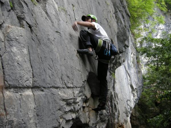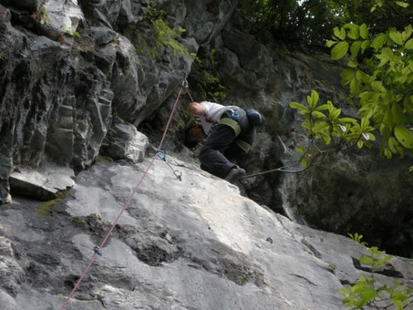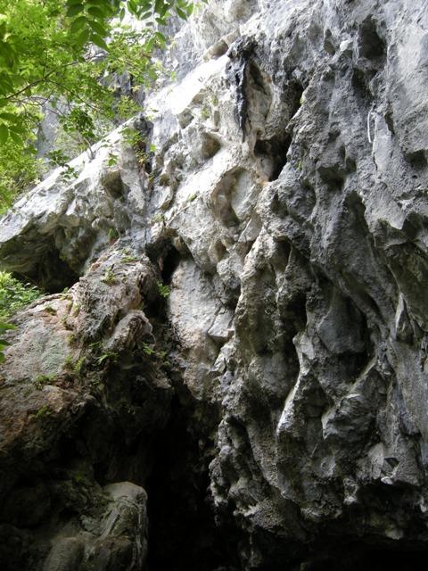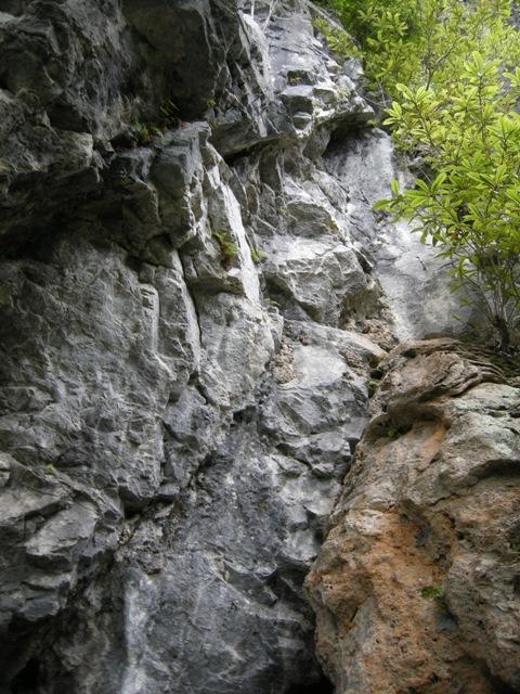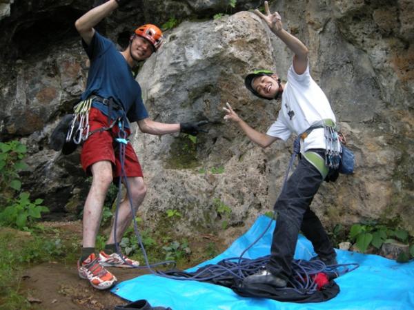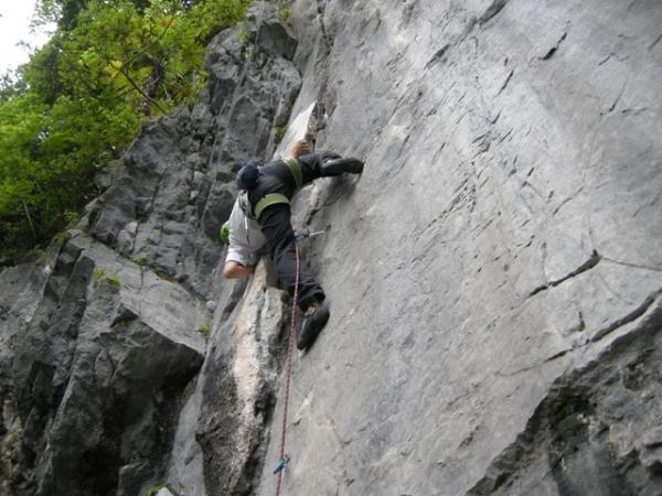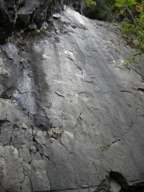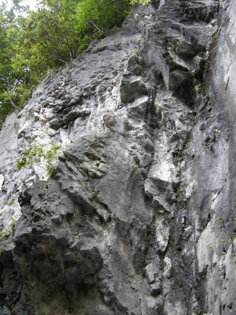 梅雨に入ってしまったので天気が悪いのは覚悟していましたが、時々雨がザァーと降るものの、壁の傾斜が全体的にキツいのと、壁の上部に生えた木々のおかげで雨にはほとんど打たれず、思ったよりまともに登れました。