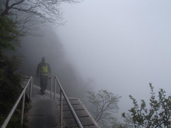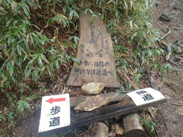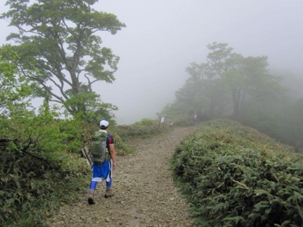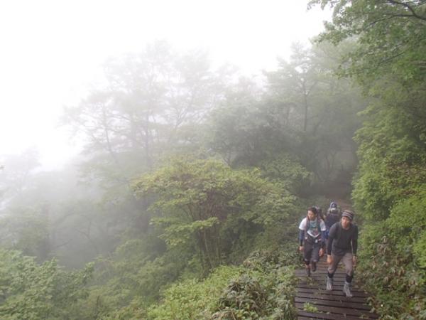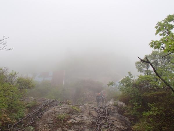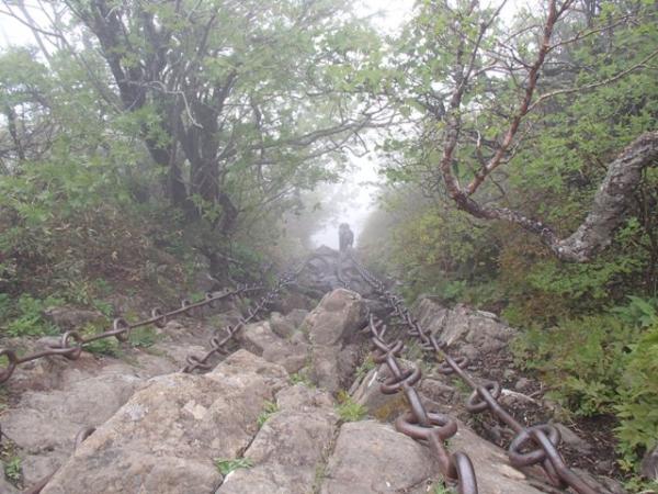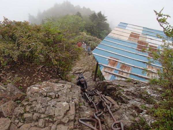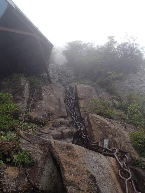 四国ツーリングの目玉だった石鎚アタックですが、到着が遅れたこととガスが全くひかないため最高峰天狗岳は次回に持ち越すことに。鎖場はぬかるんでこともあり、かなりスリルがありました。しかし、うまく鎖のリングの穴に足先を入れて三点支持を保って登ればあまり危険を感じることはありません。
