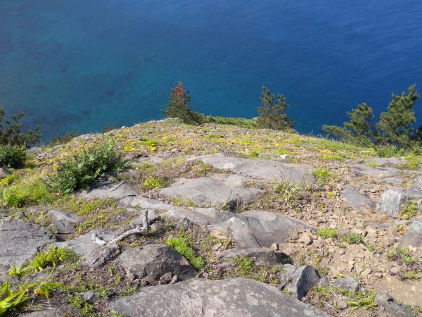 - 二ツ亀キャンプ場8:17-大野亀駐車場8:26-大野亀167m8:59(休憩)9:18-大野亀駐車場9:26(休憩)9:39-入崎-相川-矢島・経島-小木港15:07着17:00発-直江津港19:40