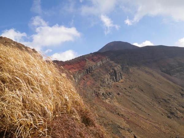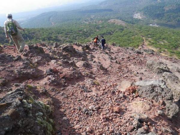 - 最初は整備された階段で登りやすいですが、途中から赤黒溶岩の急斜面となります。滑りやすいので注意が必要。この日はかなりの強風だったため、ゆっくり歩きました。御鉢の火口壁を半周する道は歩き易い。また、高千穂峰までガレの急斜面となる。登り下り共に慎重に歩く必要がある。