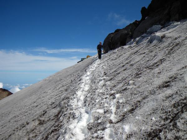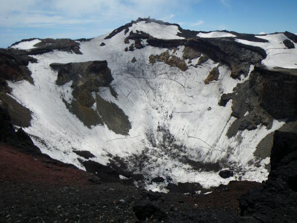③お鉢巡りの残雪部分は、蹴りこめる人はストック程度、そうでない方はアイゼンか。雪はグサグサ。