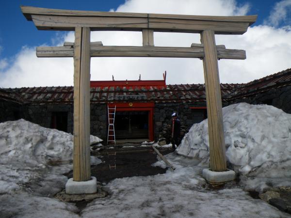 ④山頂の山小屋は準備中で、神社も営業していなかった。7月13日には開業予定。