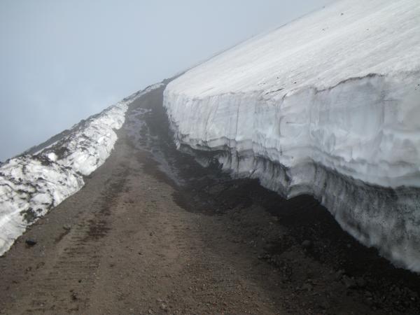 ③吉田口自体の登山道で雪道を通過する場所はない。下山道上部は雪の壁の間を通過する。
