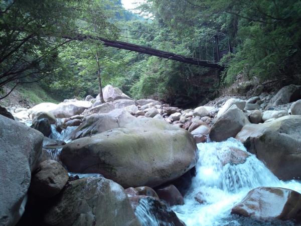 - 黒谷吊橋(入渓地点)→(60分)→2段10mの滝→(80分)→垢離取場(遡行終了地点)→(50分)→小仲坊→(20分)→黒谷吊橋