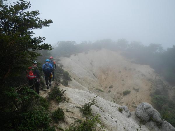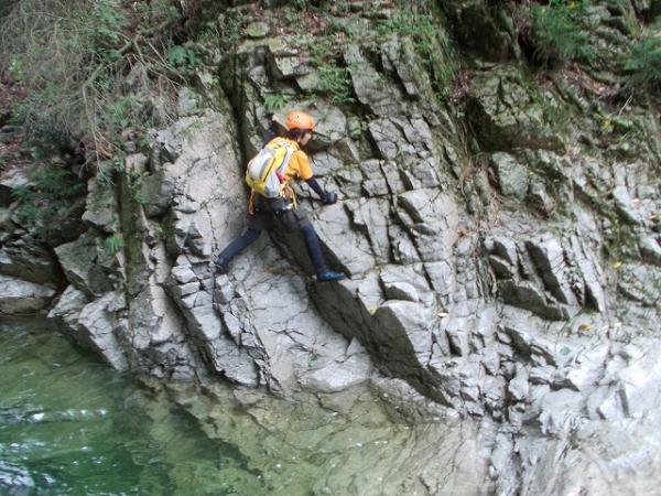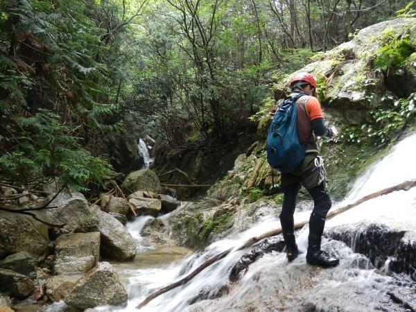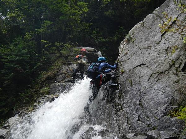 本谷に入ってからの多段25m滝上部は岩が非常にもろく、ホールドの剥離に注意が必要。