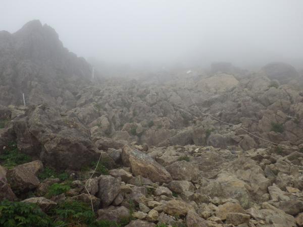 登り出しは生憎のガスの中…山頂の様子は望めない。沢を渡り、ただただひたすら岩の斜面を四足になりながら登り進んで行く。