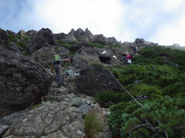 - ロープが張ってあるので道迷いの心配はありません(^ω^)滑りやすい蛇紋岩ガレ場での落石と滑落にはご注意下さい。