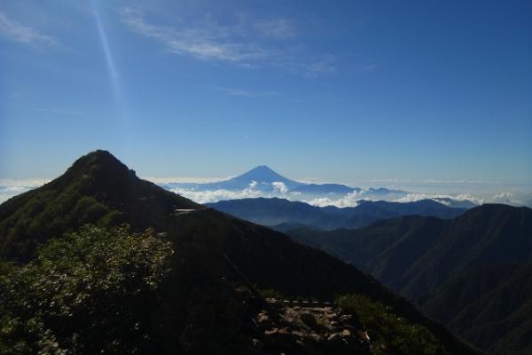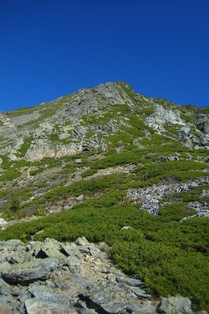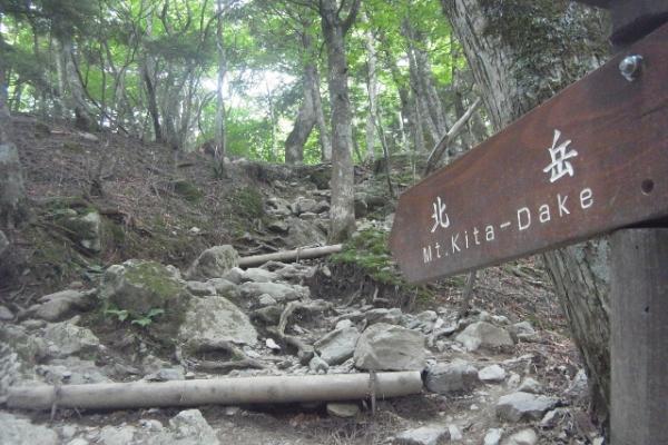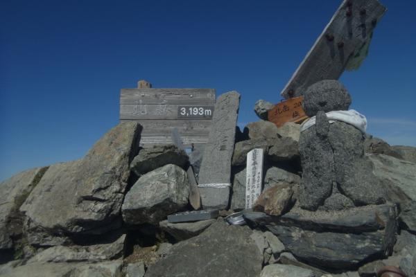 二日目は雲が昇る前に頂上に着くため、3時に起き空が少し明るくなってくるのを待ち登り始めます。テント場横の細い道を30分程歩き雪渓との出合である二俣に着きます。二俣からは雪渓右手の登山道を花々や北岳バットレスの景観を楽しみながら2時間程登ると八本歯のコル手前の丸太の梯子に着きます。足を滑らさないよう気をつけて梯子を登り、ガレた岩場を1時間程進むと北岳頂上に着きました。雲が上ってくる前に頂上に着けたので北・中央アルプスから八ヶ岳・富士山と360度のパノラマの景色を見ることができました。