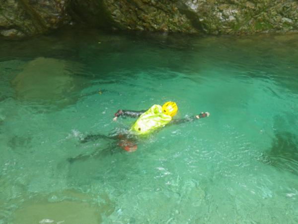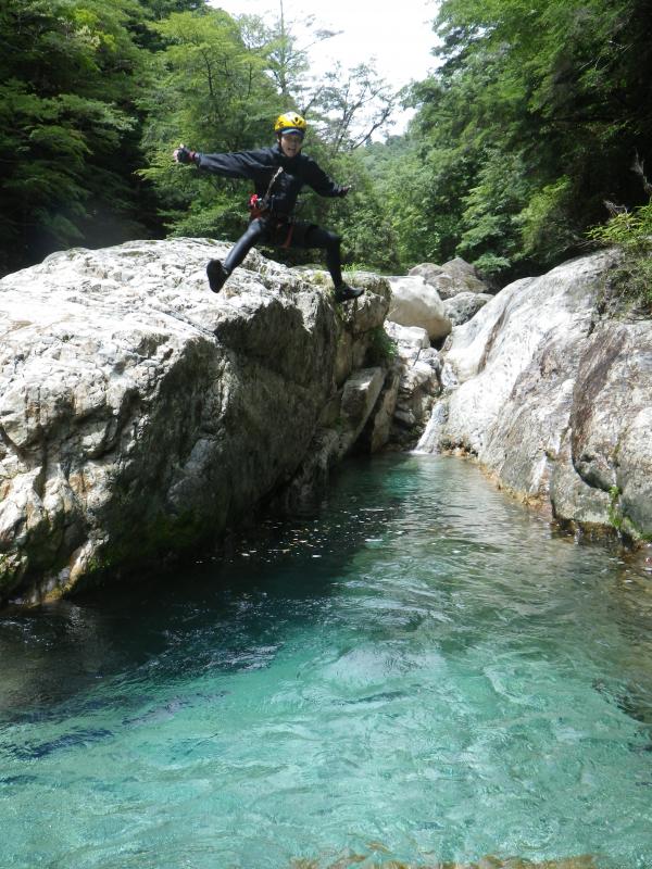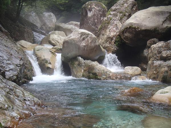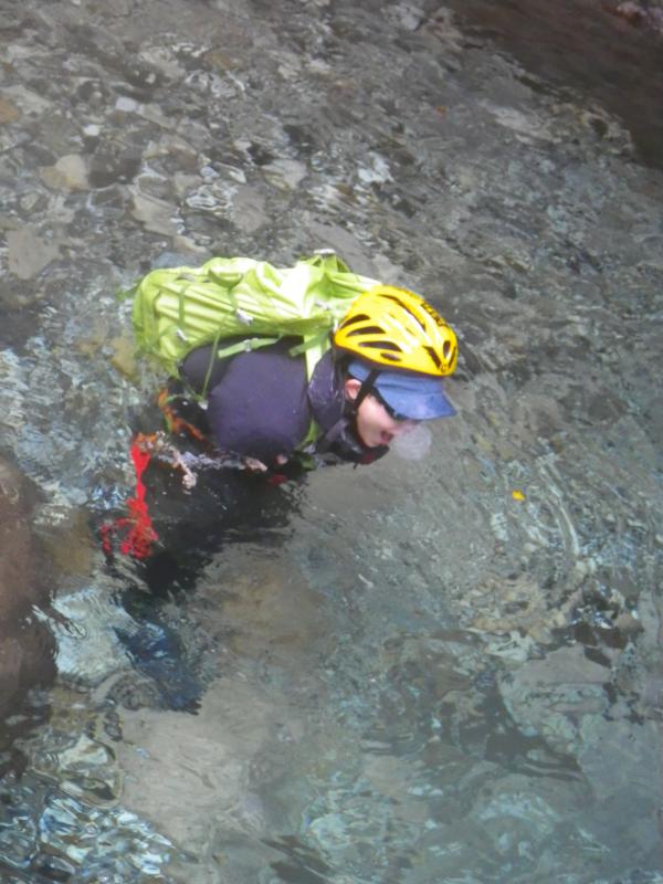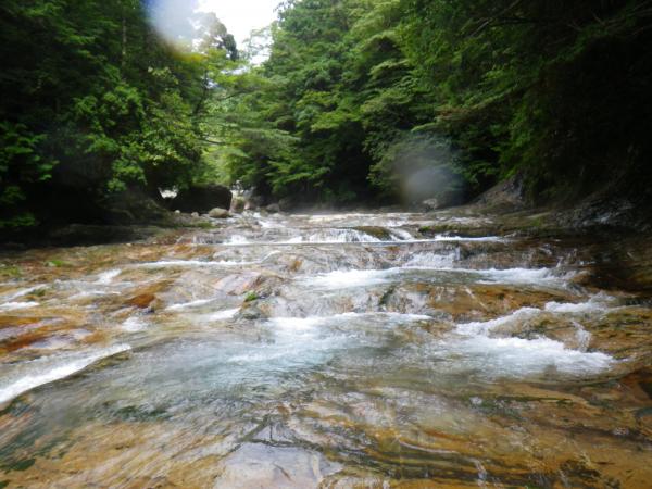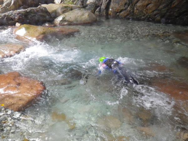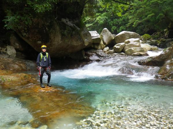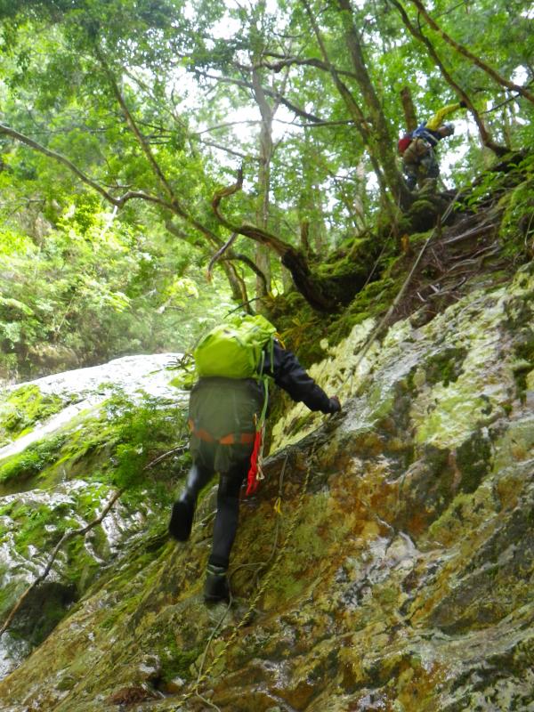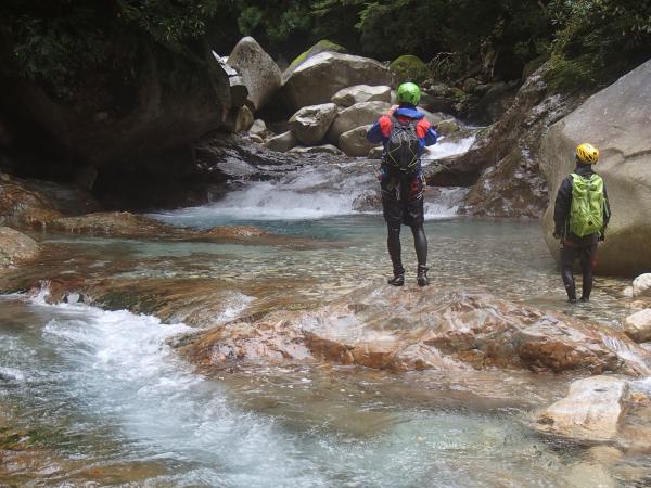 水量は多く、直登できる滝はほとんどありません。水流を躱すために巨岩を攀じり、時に泳ぎます。途中のナメ床では特にスリップに注意が必要です。ラバーソールではまるで氷の上を歩いているような感覚になりますが、それ以外のエッジのない岩にはラバーソールのフリクションが最大限活きます。