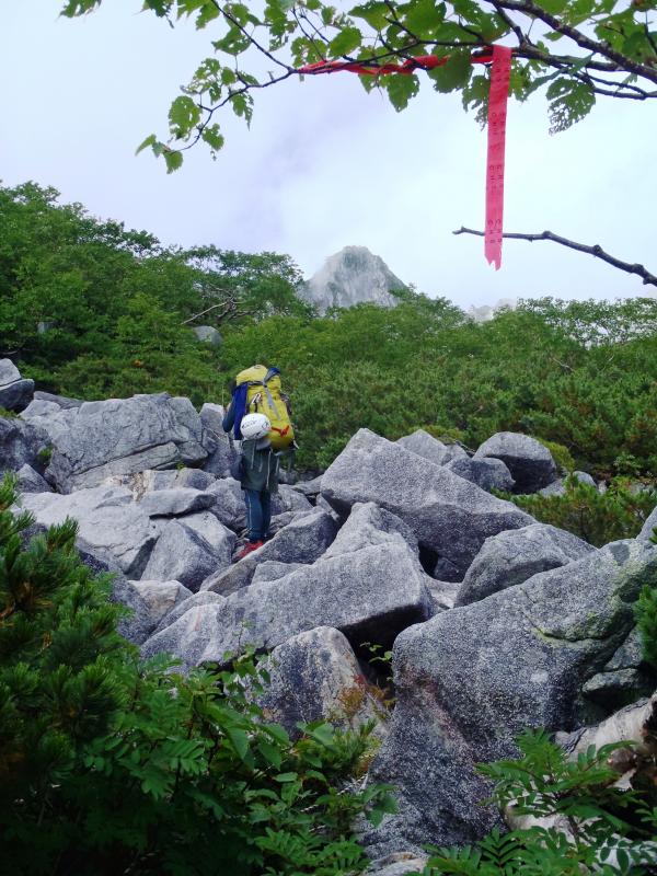 翌朝、中御所谷登山道をピンクテープ通りに稜線をつめると宝剣岳が見えてきて、