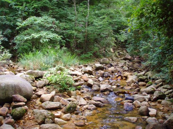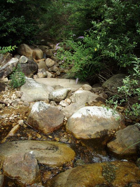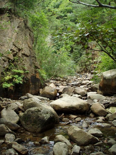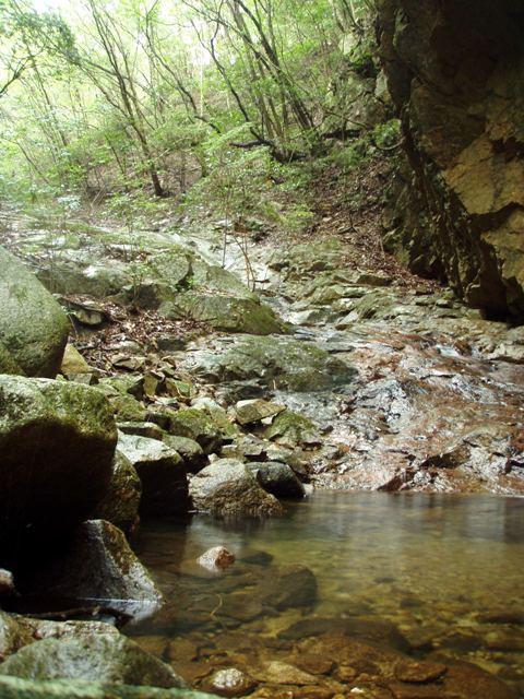 地獄谷・登山口から入り最初に出てくる沢を対岸に渡り、沢沿いの登山道を右に進み堰堤を右から巻いて下ると地獄谷下流に出られます。