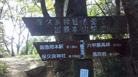 - 阪急岡本駅(10分)岡本八幡神社(20分)保久良神社(50分)風吹岩(50分)雨ヶ峠(70分)一軒茶屋(5分)六甲最高峰(60分)有馬温泉