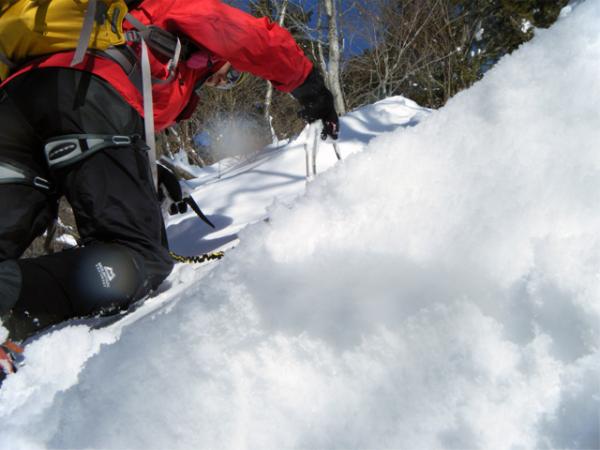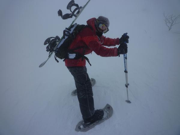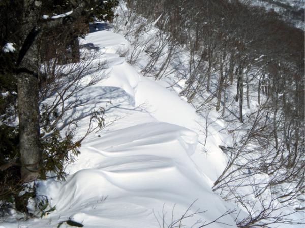 ワカンはあると便利。尾根上でもまだ木々の頭が出ていてコース取りが難航したので、もう少し積もると快適かと思う。特に序盤は昼過ぎになると雪が所々解けていて、下るのが面倒。