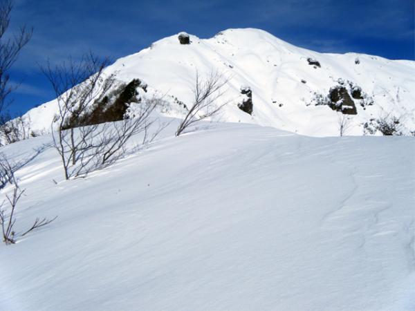 尾根に上がるとトレース無し。膝~腰までのラッセル
