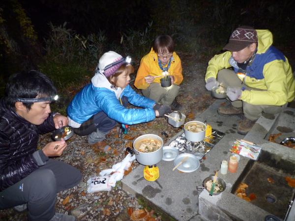 阿曽原温泉小屋に着き、テント設営、夕食を済ませ、星空が広がってから露天風呂へ行きました。飯沼さんが星空を見ながらしつこいほど「サイコーです!」を連呼するほど素晴らしいロケーション、お湯、です!!小屋に泊まった鷲尾さんのレポートにもありますが、小屋の食事も美味しく、夜にDVD鑑賞会を催してくれるなどオヤジさんのお人柄もサービスもよい小屋です。