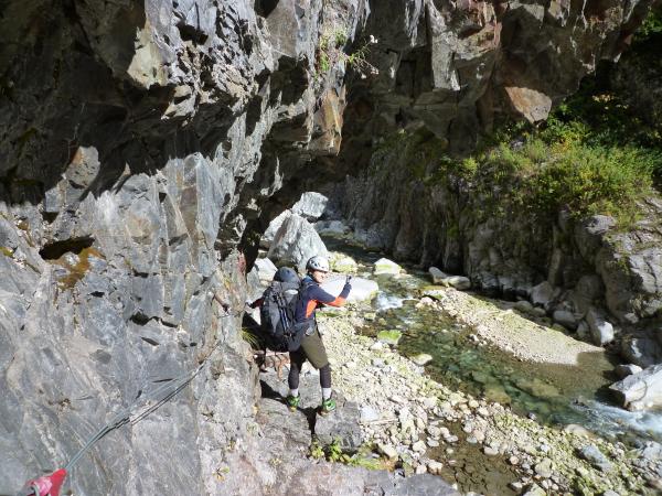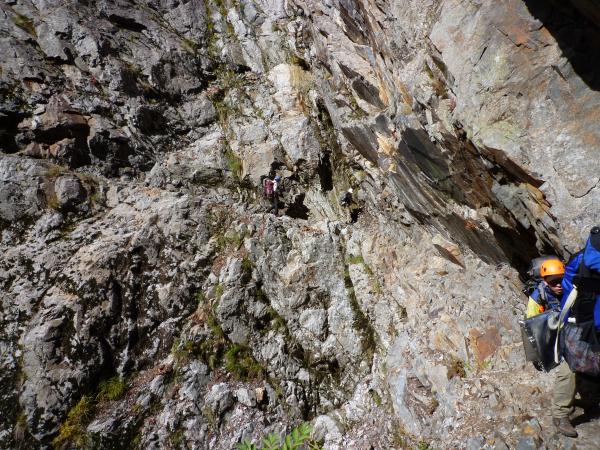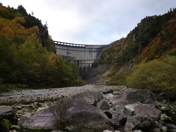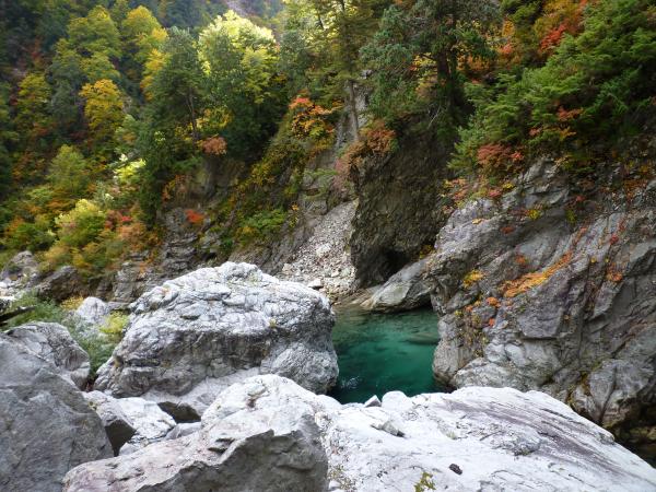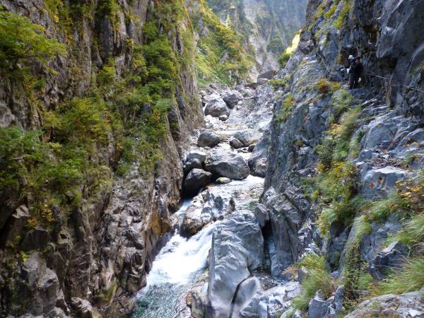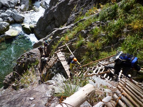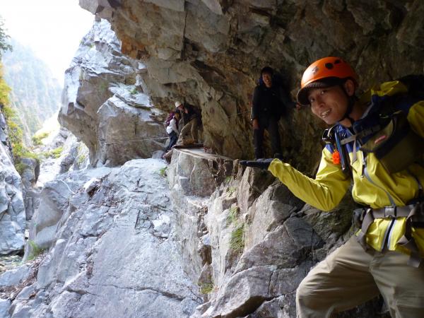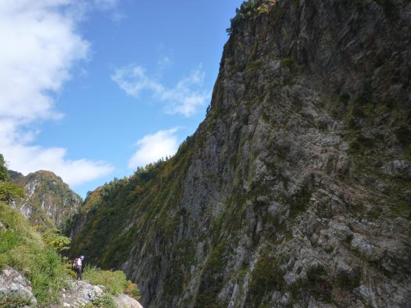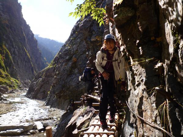 19日(金)、朝から快晴。しかし、黒部ダムから下ノ廊下(旧日電歩道)への入り口がわからずウロウロ(@_@;)。前日に駅の係員の方などに伺っておくほうが無難です。駅構内から外へ抜けるのですが、早朝は駅へ入るドアが閉まっています。脇の道を入るのですが知らなければここは…。しばらくは危険箇所もなく会話も弾みます。紅葉の具合は…“やや早い”くらいか。見上げる山の中腹くらいが真っ盛りでした。黒部ダムの標高が1550mでこの周辺は紅葉見ごろ。下ノ廊下が始まる内蔵助出合が1360m、関電人見平が880m、この間が下ノ廊下ですがこのときの紅葉は1500~1700mくらいが見ごろだったのでしょうかね~。スタートして3時間ほどの別山岩屋辺りから本格的な下ノ廊下、つまり肝が冷えるヘツリが始まります。この辺りから皆ヘルメット着用。ハーネス、スリング、カラビナ、明星はロープも用意し、有事に備えましたが、結局ヘルメット以外の出番はありませんでした。しかし、岩をくり抜かれた登山道は狭く、皆何度か頭を打ちましたのでヘルメットは必携です。東谷吊橋まで緊張感を強いられますが長いこの橋渡れば(*この橋もスリリングで楽しい♪)、あとは楽しいハイキング。でも後半で8時間近く歩いてきた脚にはこたえます(+o+)。高熱隧道は奥で噴出する高熱泉の影響でモワッと感じるほどの灼熱区間。しかもこんな山奥なのに関電の電車が登山道を横切っており(いや、横切っているのは電車がではなく「登山道が」かな)、時々作業員の方の乗った電車が通ります。通過前には警笛が鳴りますがご注意を。