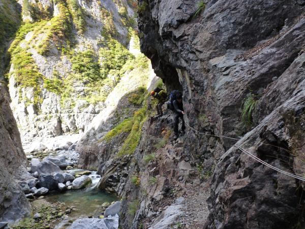 “核心部”へ入ります!!『黒部別山谷』、『白竜峡』の前後は常に断崖!右手には黒部川が流れ、左は岩壁が迫る!細いワイヤーロープだけが頼り。頭上はくり抜かれた岩が迫り、何度か頭を打つこと必至!十字峡広場が唯一開けた場所で休憩敵地です。
