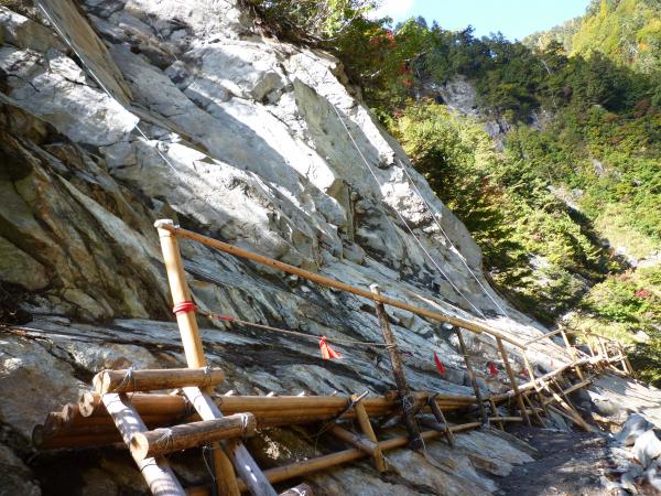 危険箇所皆無。しかも舗装道。湖畔の紅葉を愛でながらのんびり歩こう。ただし、黒部ダムから下ノ廊下への入り口がわかりにくいです。二日目に我々も迷いました(+o+)。早朝ゆえ周囲に人もおらず、単独でやはり下ノ廊下を行く予定の登山者の方と一緒に探し回りました。運よくダムの対岸から荷物を扇沢方面へ運ぶトラックに乗った方がやってきたので伺い事なきを得ましたが…。