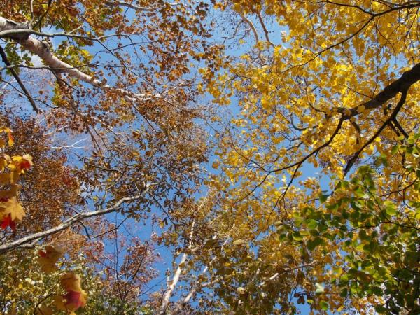 樹林帯に入ると風も止み、色とりどりの木のトンネルの中をトレッキング。延命水は口当たりまろやかで、とても美味しかった。