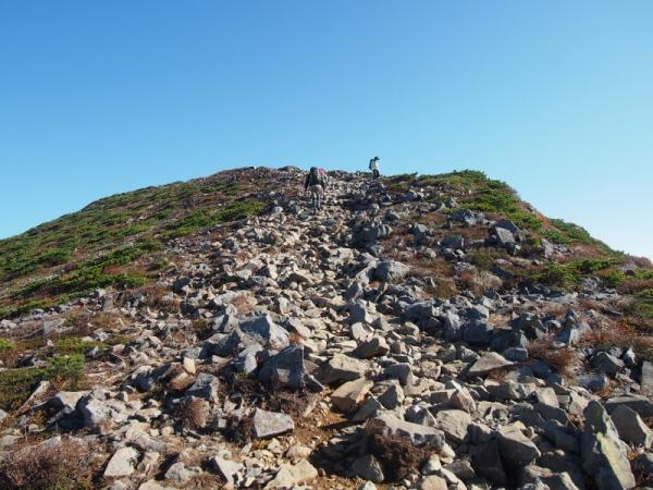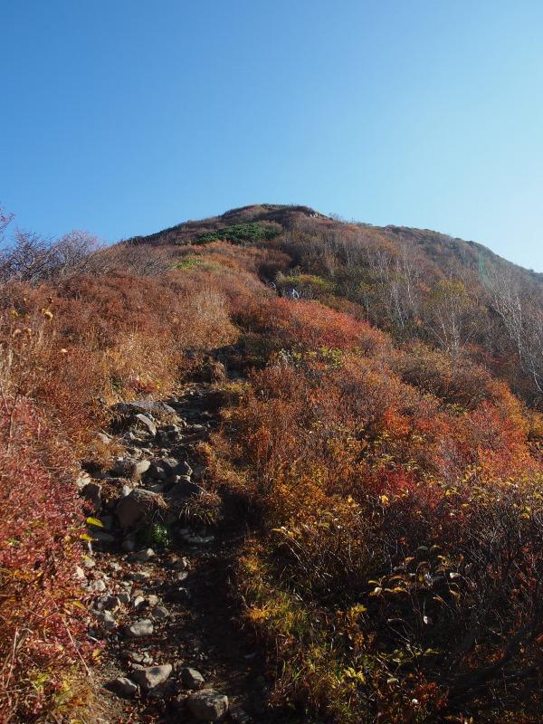 三斗小屋から熊見曽根東端まではそれなりに急な登り坂だが、道はきれいに整備されており、また茶臼岳と朝日岳がよく見えるので楽しく歩ける。
