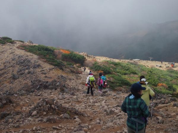 朝のうちは眩しいほどの青空が広がっていたが、三本槍岳から引き返すあたりから雲に覆われ始め、ほとんど周りの景色は見えなくなってしまった。早めに出発して本当に良かったと思った。