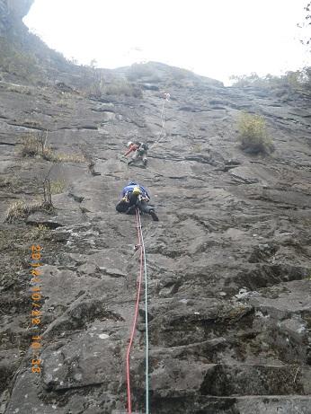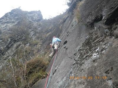 トイレある七号橋の駐車場に仮眠、登山口にあるポストに登山届、この先危険という案内板からひだりに行きます。トータル小一時間でとりつきに。グーパーでパートナー決めて登る。 1~2Pをつなげて。左にハイステップで乗り込む1手があります。ネットで脅されたわりにはフリクション良く、クリップ位置のホールドも良いので、安心しました。3P目はフレークをつかむ一手の核心以外は1P目のようなバランシーさはなく快適。4P目、突き上げたら左にトラバースして平らになる終了点へ。5P目、適当にカチがあるフェースが続きます。1ピン目のヌンチャクは両パーティーも登るうちにボルトから自然に外れて落ちてきました。岩というよりアルミハンガーのボルトがネジより飛び出ていて、ビナに干渉してゲートが開いてしまい、ロープを繰り出した瞬間に外れたと思われます。屈曲しないルートで何本かクリップしていたし、落ちないからいいけど、場合によっては危ないです。さらに上でもボルトネジとハンガーにビナが挟まりロックされて取れなくてビナはバリバリに傷ついてしまいました。