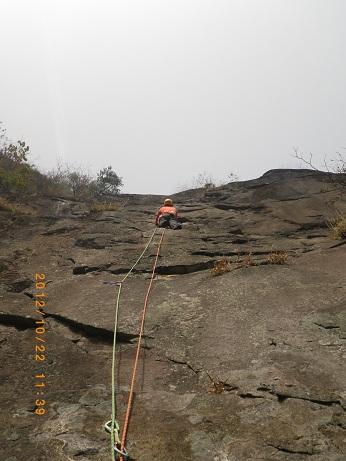 6P目は頭にでる短い凹角。子供が登山道から来て見てます。獅子岩上は薄くガスの中。あまり眺めはよくありませんが、まわりは紅葉の様子。