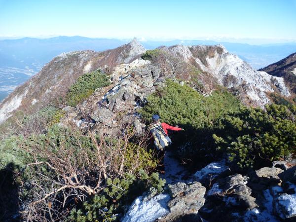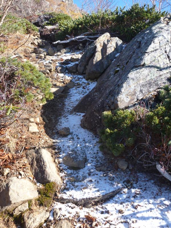 - 稜線上の日陰部分には、わずかに雪が積もっていましたが、アイゼンは必要ありませんでした。ただし、うっすらとはいえ、雪がついた岩は滑りやすいので、慎重に通過する必要があります。また、夜はかなり冷え込むので、十分な防寒対策が必要です。