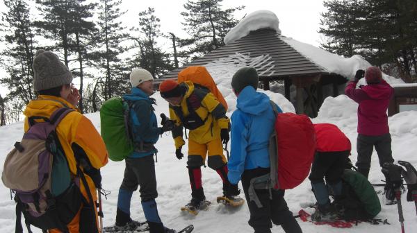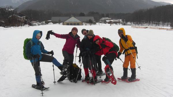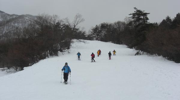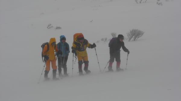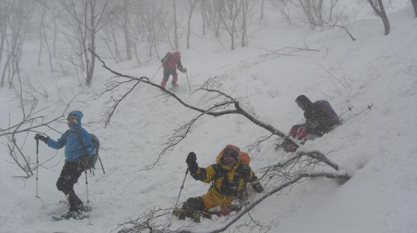 毎年恒例の、スノーシューツアーに参加しました。 私が参加すると天気が荒れると言うジンクスは今年も当たり、スタート時は小雨。 稜線上は強風で早々に撤退しました。