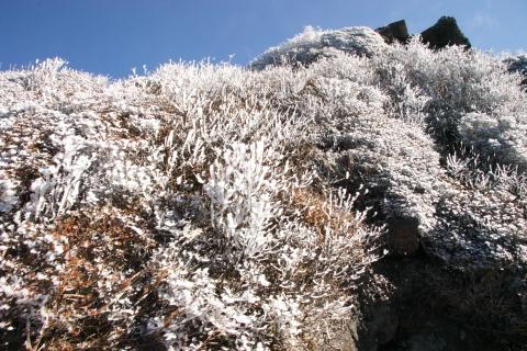 山頂付近の霧氷がきれいでした。夜はだいぶ冷え込みましたがー6℃まで対応の寝袋にダウンなど着こんでぐっすり寝られるくらいでした。
