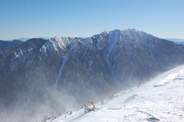 山荘~独標 1日目稜線にでた途端、強風!!!時々、耐風姿勢をとりました。