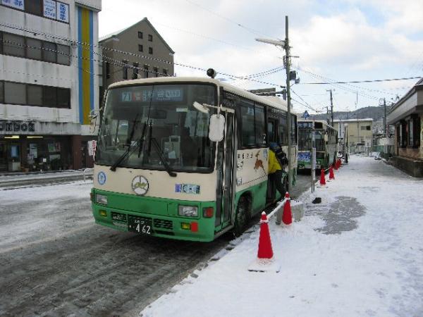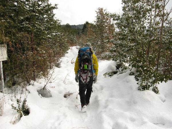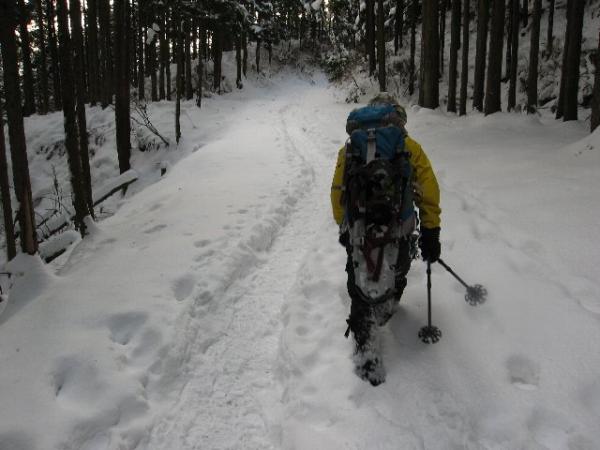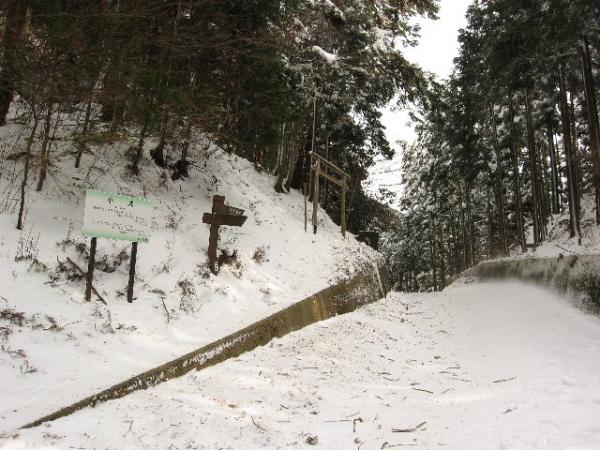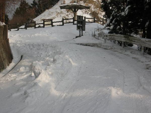 国道から大峠までの車道(旧道)は積雪がありました。この日は固く閉まった雪でわだちが深い所があるので4輪駆動車など車高の高い車でないと苦労するかもしれません。降雪があったり凍結したりと条件が変わるのでバス利用か高見登山口やたかすみ温泉に駐車するのがベターです。