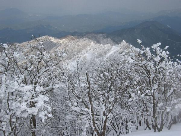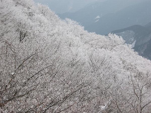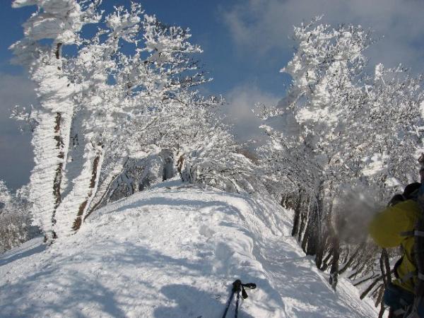 風が強い以外は晴れたり曇ったりの天気でした。風が強いおかげで霧氷やエビノシッポがきれいにつき、青空を背景にしてとてもきれいな風景が広がっていました。