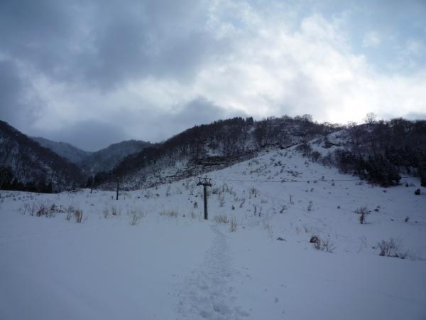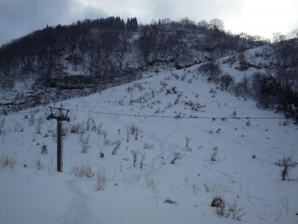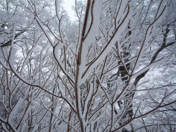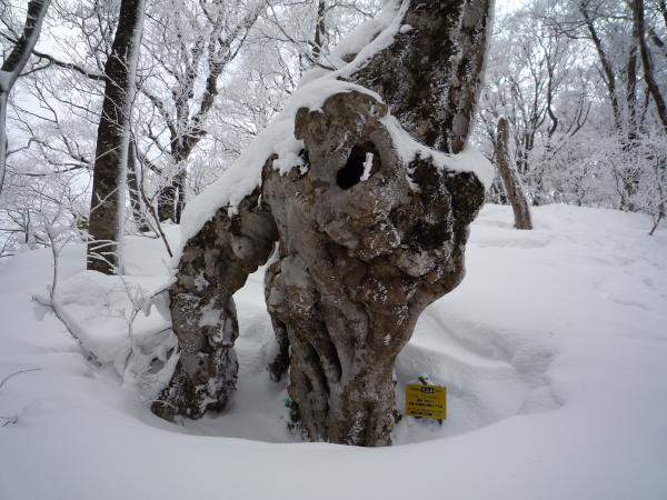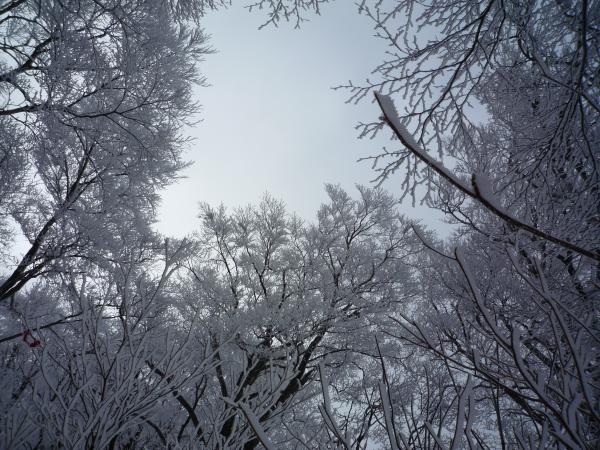 - 前夜に降雪あり。スキー場はツボ足で膝ぐらい。リフト終点よりワカン装着。マーカーは少し分かりにくい。先行者のスキーヤーの方のトレースを辿る。森の中をひたすら登り。標高1100m付近から、勾配がキツくなる。シャクナゲ平で少し開け、荒島岳が見える。