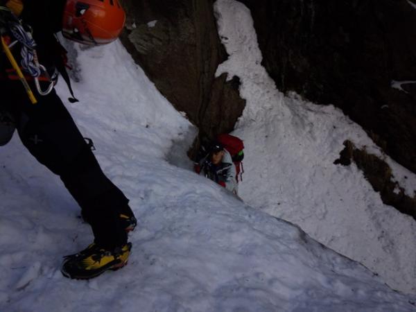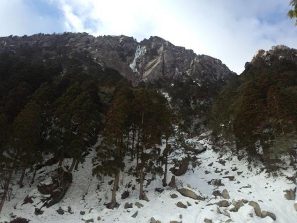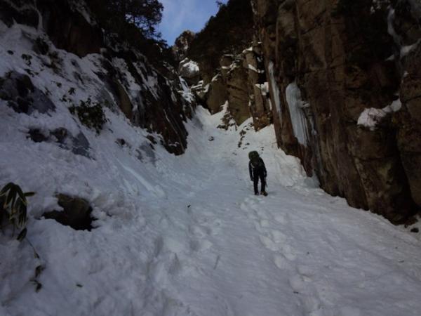- 3日前から冬型が緩み、この日も気温は高め。藤内壁出合いまではアイゼンの必要性を感じなかった。気温が高いので、もちろんアイスも後退していた。