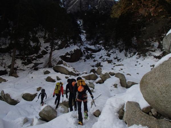 - 冬季ゲート→(15分)裏道登山口→(30分)藤内小屋→(20分)藤内沢出合→(90分)2ルンゼ奥又