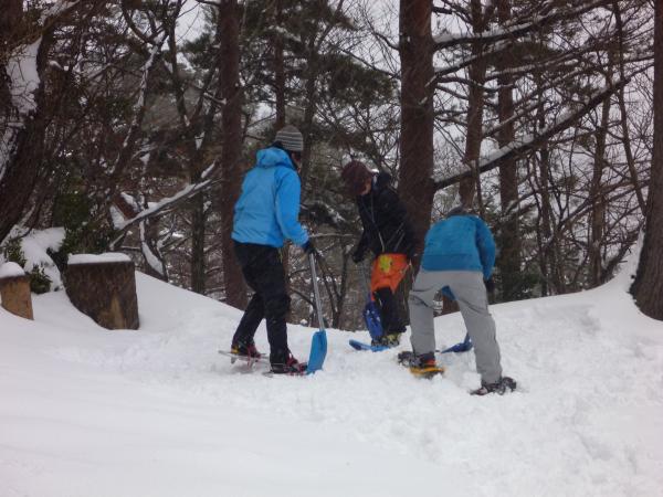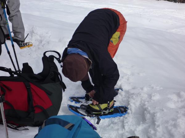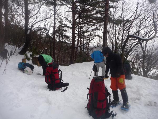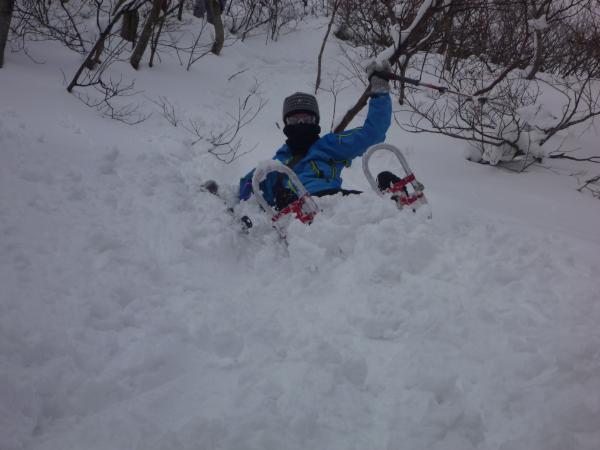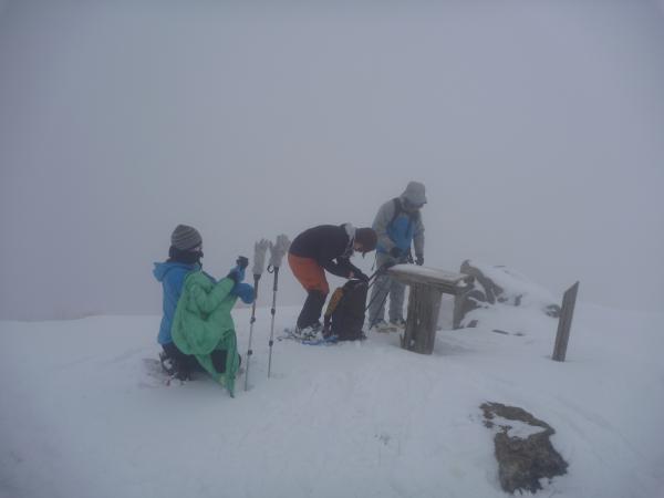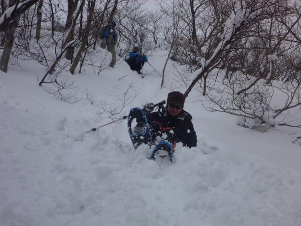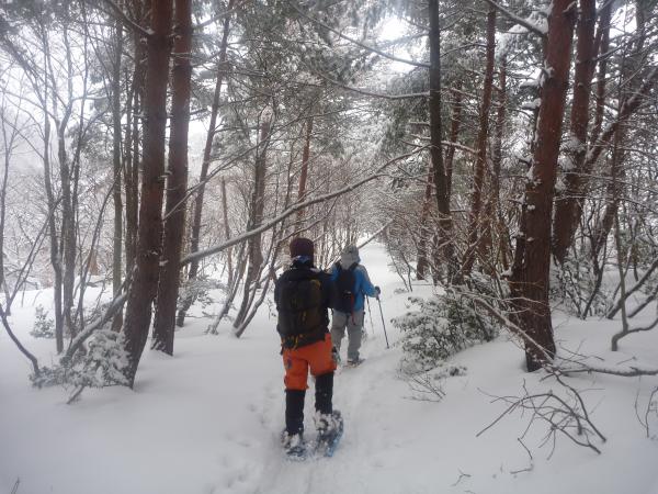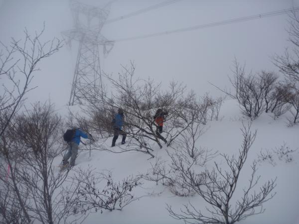 夜半からの降雪により、赤坂山へのスノーシューハイクは新雪を踏みしめて、とても楽しい歩行となりました。鉄塔付近から広い稜線にかけて一気にガスが発生し、ルートファインディングが難しい感じになりました。