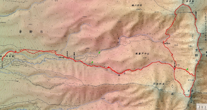 - 行者小屋→(70分)→地蔵の頭→(110分)→横岳→(50分)→硫黄岳→(50分)→赤岳鉱泉→(30分)→行者小屋→(140分)→美濃戸口