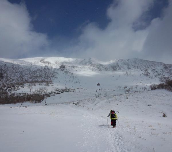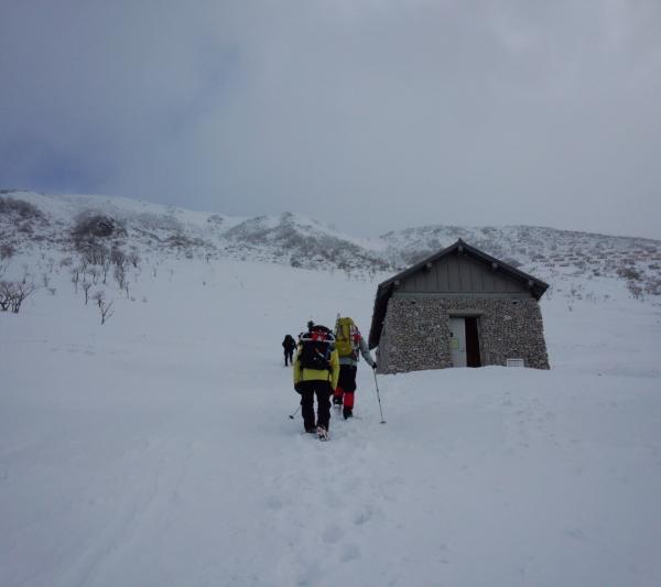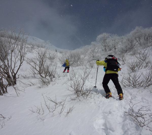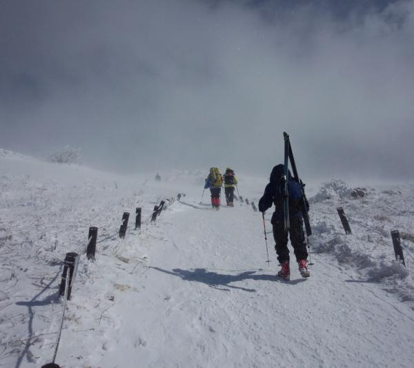 と思っていたのですが、天気予報では冬型の気圧配置になり、お天気が悪く、視界がなさそうなので、スキーはあきらめ、普通に雪山登山としました。