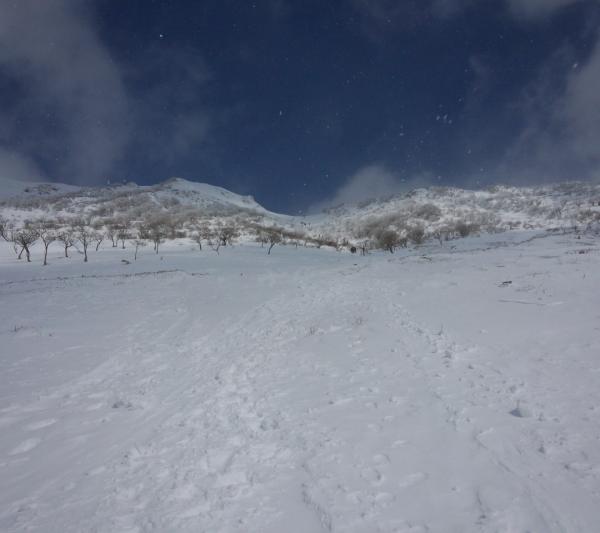 1合目からスキー場の跡地を登っていきますが、ここも雪が中途半端な状態。