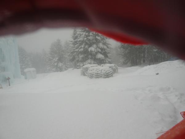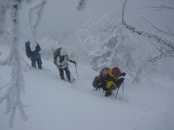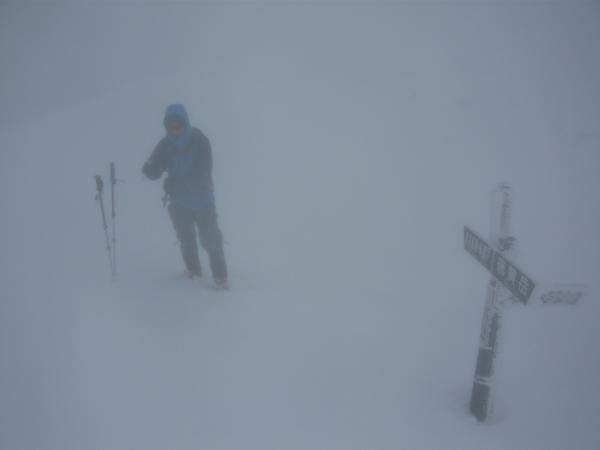 頂上付近は、強風と雪で10m進むのもかなりの時間がかかり、やむを得ず撤退しました。