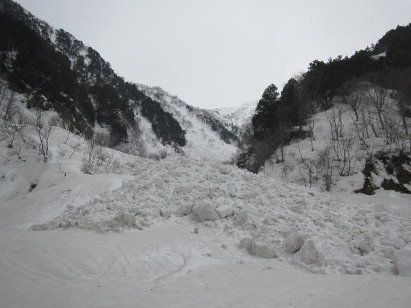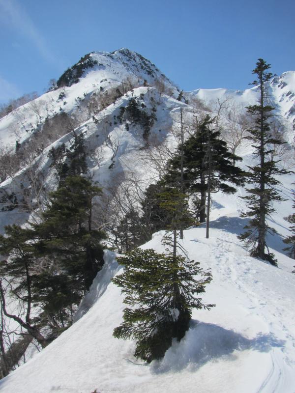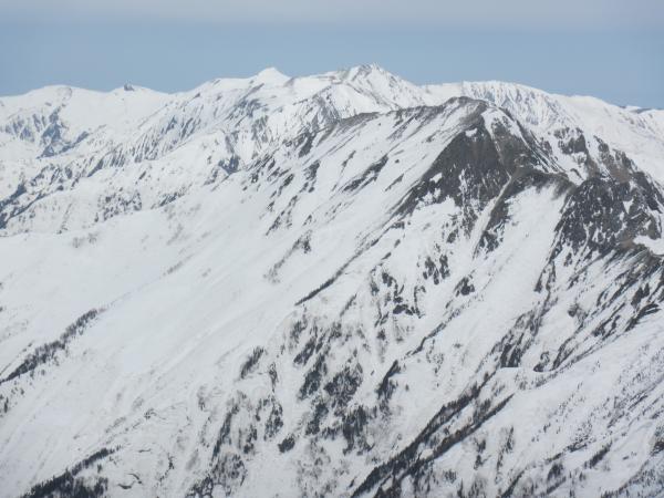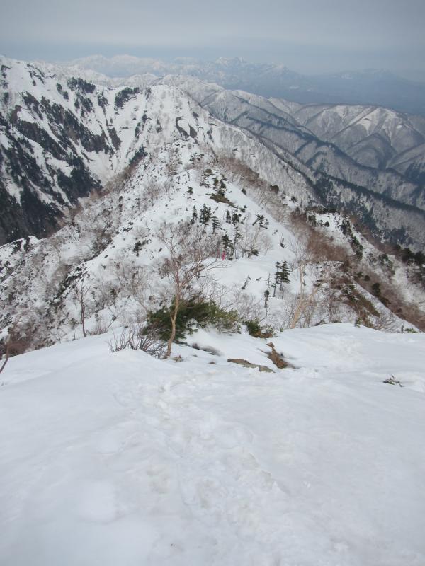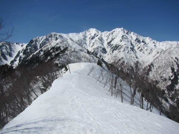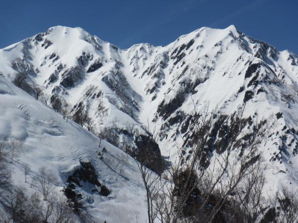 爺ヶ岳南峰から派生する一番危険性が少ない確実なルートですが、一般的には扇沢への道路が開通してからでないと使われません。