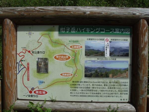 - 大原橋・バス停~(30分)~一ノ谷・登山口~(30分)~柑子岳△254.5m~(30分)~村上登山口~(10分)~一ノ谷・登山口~(30分)~大原橋・バス停
