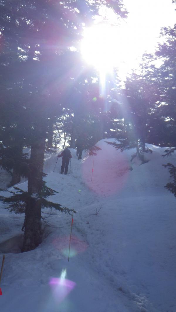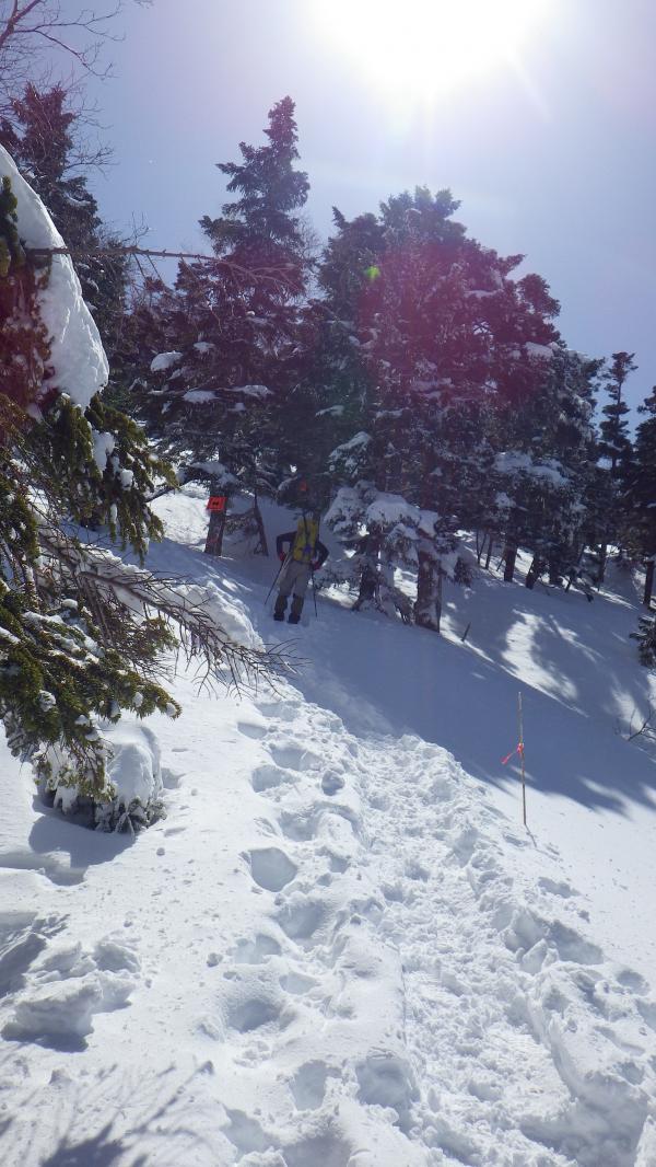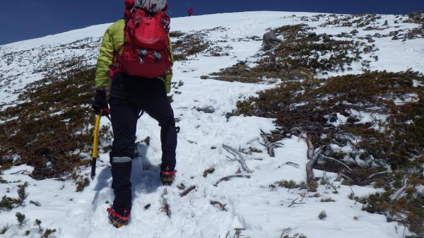 - 4月の頭にしては雪がだいぶ少ないようですが、もちろんアイゼン(12本爪)・ピッケル必携です。ロープウェイ山頂駅を出てすぐに装着し、山頂駅に帰ってくるまで終始着けていました。午前中の登りでは雪がしまってアイゼンしっかりきいていましたが、午後の日差しで雪が溶け帰りは所々アイゼンきかずにズールズルと歩きずらかったです。一歩一歩慎重に!ですね。