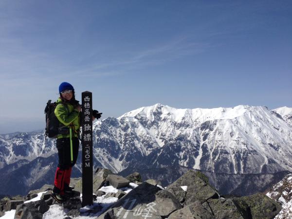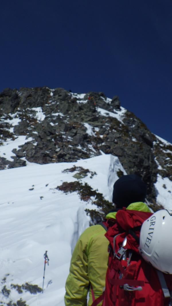西穂山荘名物のラーメンを食べ、山荘から上の稜線歩行はとにかく気持ち良かったです。稜線フェチにはたまりません。独標手前の左側の斜面が大きく開けた箇所をを通過する時には転倒に注意が必要です。その後の独標への岩場もところどころに雪が残っており、気温が高かったので半端に溶けていて少し神経を使いました。独標から更に先も・・・いつか行ってみたいなぁ。