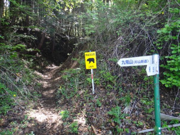 - 富士急行禾生駅→(10分)→落合陸橋→(40分)→弥生峠→(20分)→富士見平→(5分)→九鬼山山頂→(5分)→池ノ山コース分岐→(7分)→天狗岩→(10分)→愛宕神社分岐→(20分)→池ノ山コース登山口→(20分)→富士急行田野倉駅